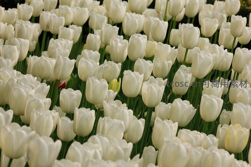 无数洁白的郁金香整齐排列,形成一片无瑕的白色花海,如同覆盖大地的初雪,散发着宁静、高雅与纯粹的美感。
