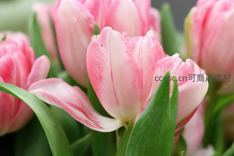 近距离拍摄的粉白渐变郁金香,细腻的花瓣纹理与娇嫩的色泽尽显柔美,绿叶点缀更添自然生机。