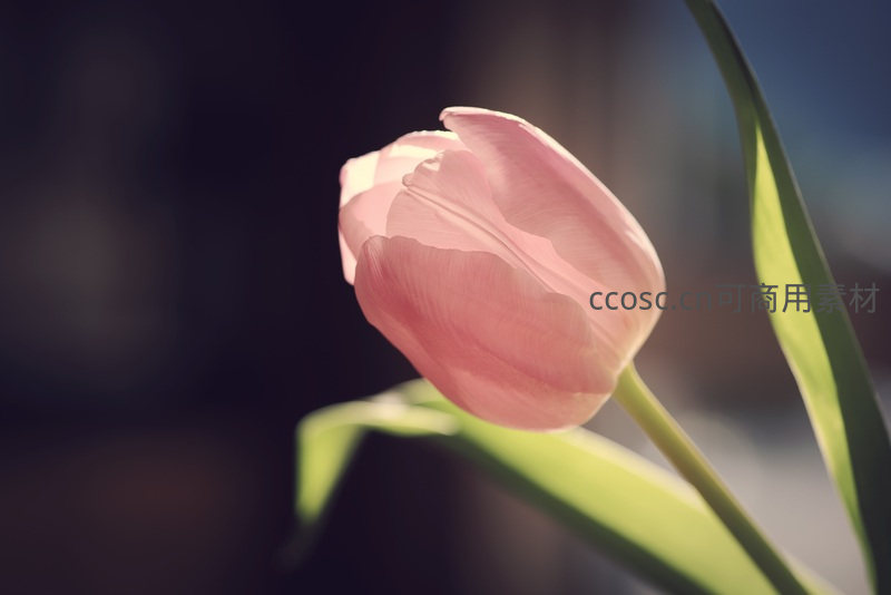 一枝粉色郁金香在清晨柔和的逆光中显得格外娇嫩,光线穿透薄如蝉翼的花瓣,勾勒出其优雅的轮廓,营造出温暖宁静的氛围。