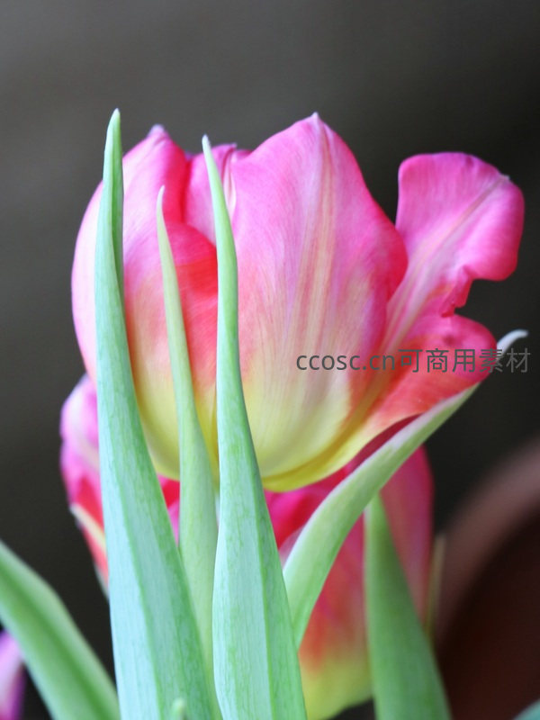 粉红郁金香绽放,绿叶衬托娇艳欲滴