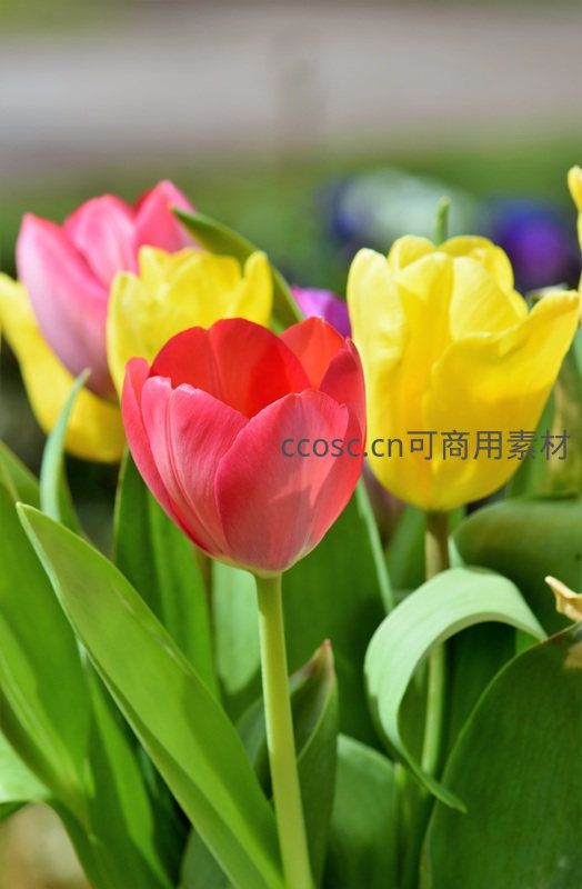 阳光下,一片五彩缤纷的郁金香花田生机盎然,红色、黄色花朵交相辉映,绿叶随风轻摆,展现春日活力。