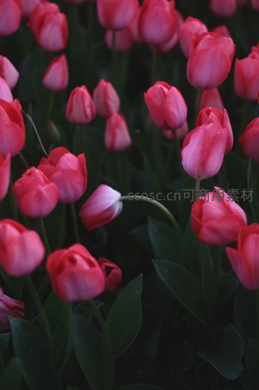 在幽暗的背景下,粉红色的郁金香显得格外突出,深色叶片与明亮花瓣形成强烈对比,营造出一种静谧而富有戏剧性的艺术感。