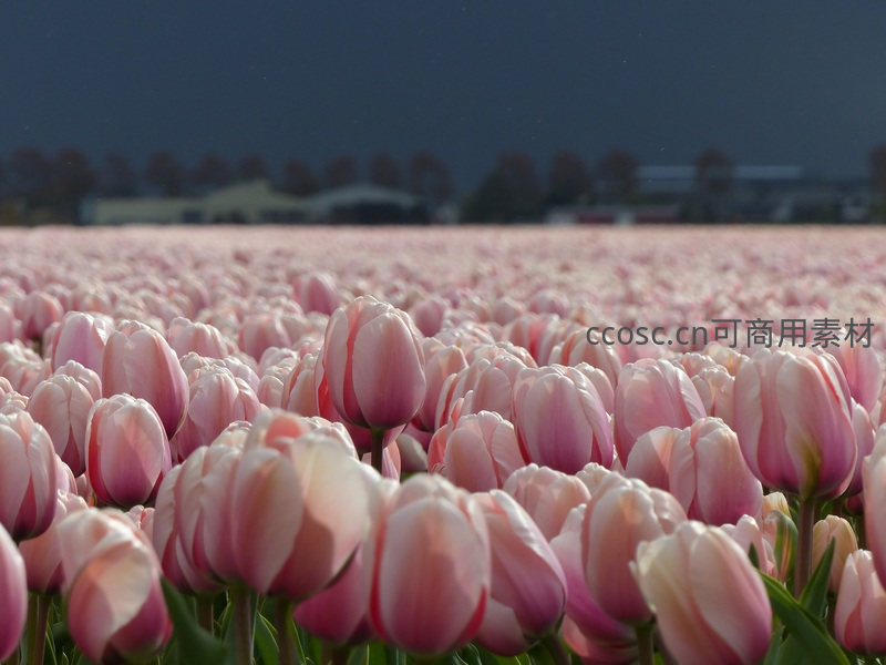 清晨薄雾笼罩下,广袤的粉色郁金香田延伸至天际,远处建筑轮廓朦胧,整个画面宁静祥和,展现了田园风光的壮丽与温柔。