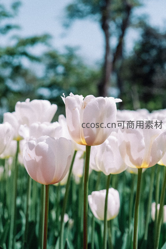 在明媚的春日阳光下,一片洁白的郁金香花海随风摇曳,背景是模糊的绿树蓝天,营造出宁静而浪漫的自然氛围。