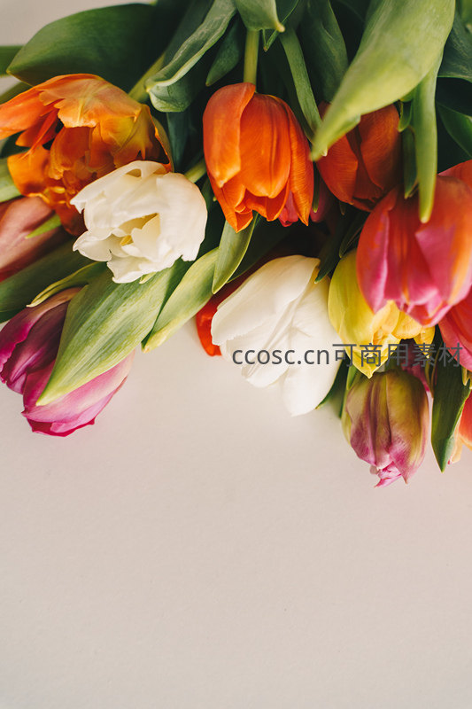 一束色彩丰富的郁金香在纯白背景下绽放,橙红、粉紫与洁白交织,绿叶衬托,展现春日的活力与柔美。