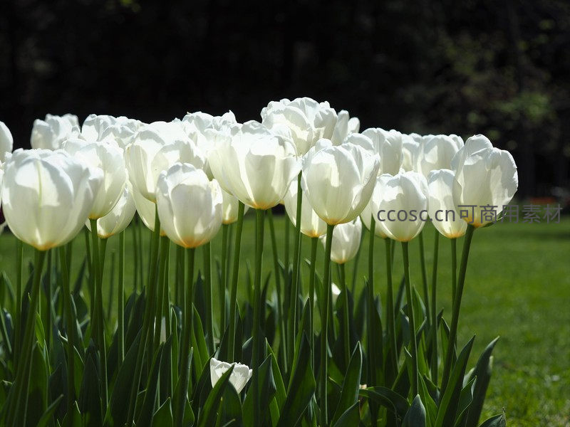 在明媚阳光照耀下,一片洁白的郁金香整齐排列,绿茎挺拔,背景深邃,尽显纯洁与优雅之美。