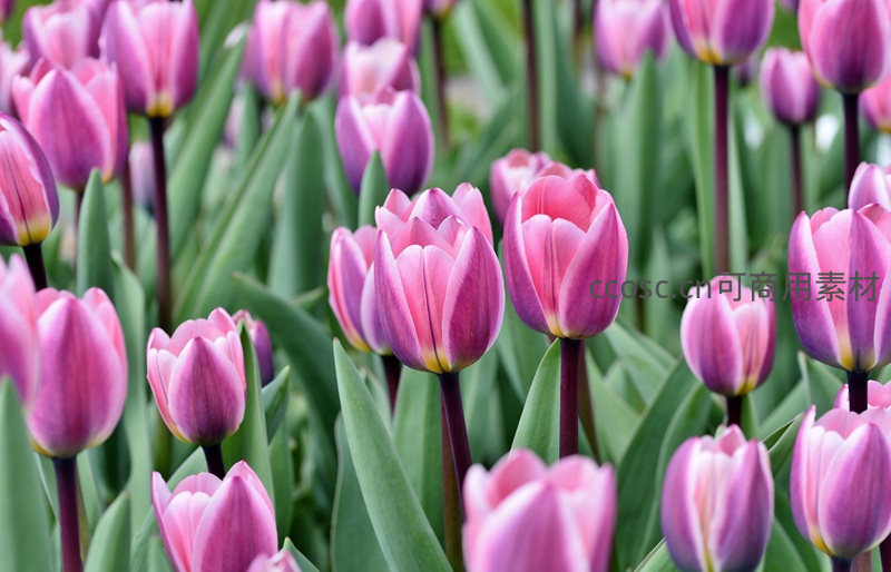 成片的紫色郁金香在田野中竞相绽放,花瓣层次分明,色调柔和,营造出如梦似幻的春日氛围。