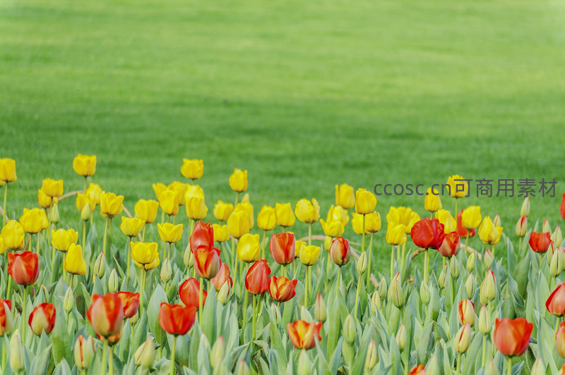 鲜艳的红黄郁金香在翠绿草坪边缘竞相开放,色彩对比强烈,展现了春日花园生机勃勃、清新开阔的自然美景。