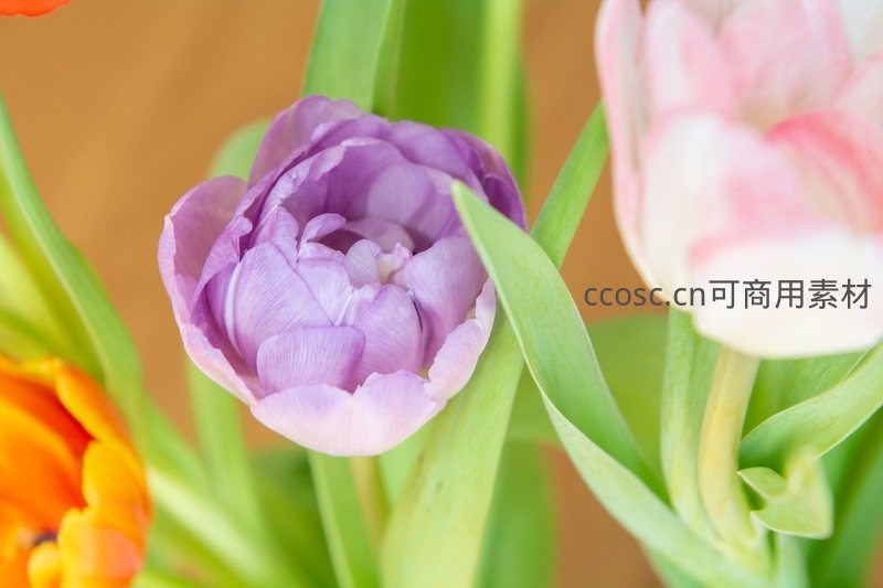 微距镜头下,一朵紫色重瓣郁金香的花瓣层层叠叠,纹理清晰可见,周围绿叶衬托,尽显其精致与柔美。