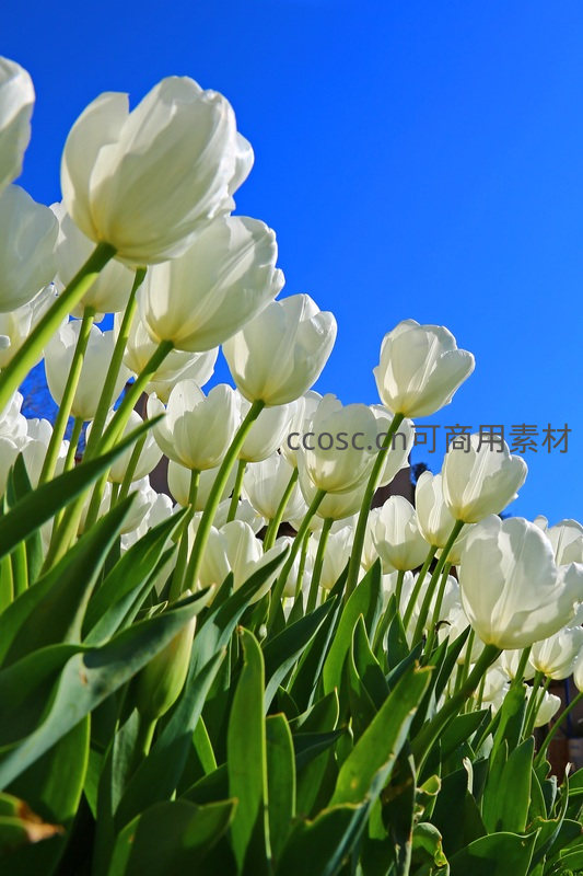 从低角度仰望,洁白的郁金香在湛蓝天空的映衬下显得格外纯净高雅,阳光洒落,绿叶繁茂,充满向上生命力。