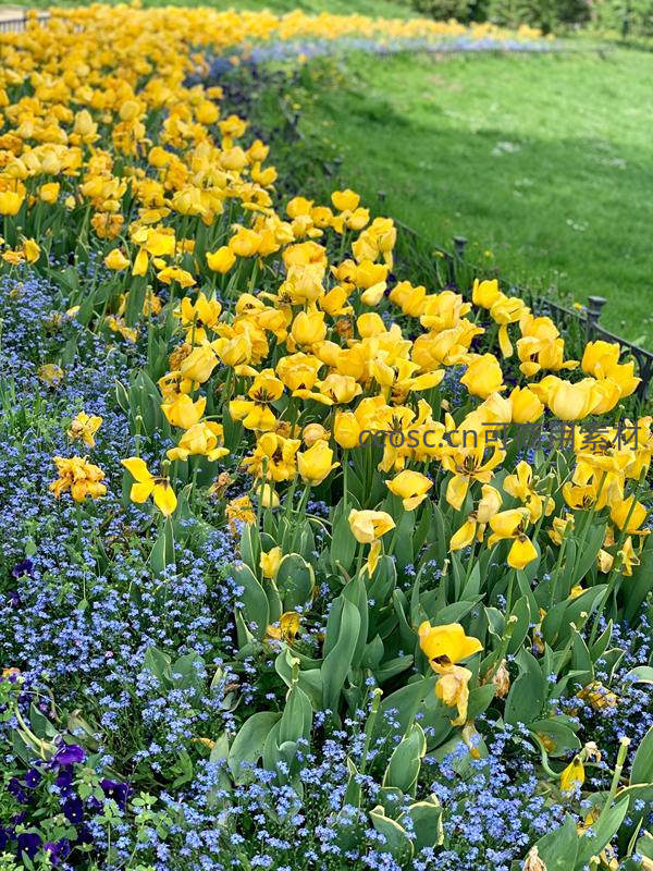 大片金黄色郁金香与前景的蓝色小花形成鲜明对比,后方是青翠草坪,构成一幅色彩丰富、层次分明的春日园林图景。