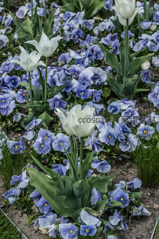 洁白的郁金香亭亭玉立,在一片蓝紫色三色堇花海中格外醒目,绿叶点缀其间,构成一幅清新雅致的春日花园画卷。