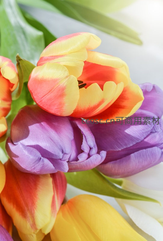 近距离捕捉多色郁金香的绚烂瞬间,黄、橙、红、紫等色彩交织,花瓣质感柔软,阳光下光影斑驳,尽显春花的热烈与活力。