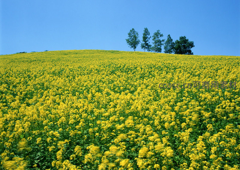连绵起伏的山丘被盛开的油菜花染成一片金黄,山顶处几棵挺拔的树木在蔚蓝天空下形成天然的画框,景色美不胜收。