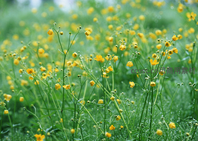 细长的茎秆上点缀着娇小的黄色野花,晶莹的晨露挂在叶片和花瓣上,在柔和的光线下显得格外清新,充满自然的诗意。