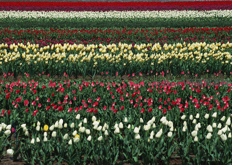 不同颜色的郁金香按行种植,形成鲜明的色块和条纹,展现了人工与自然结合的秩序美,是春季不可错过的视觉盛宴。