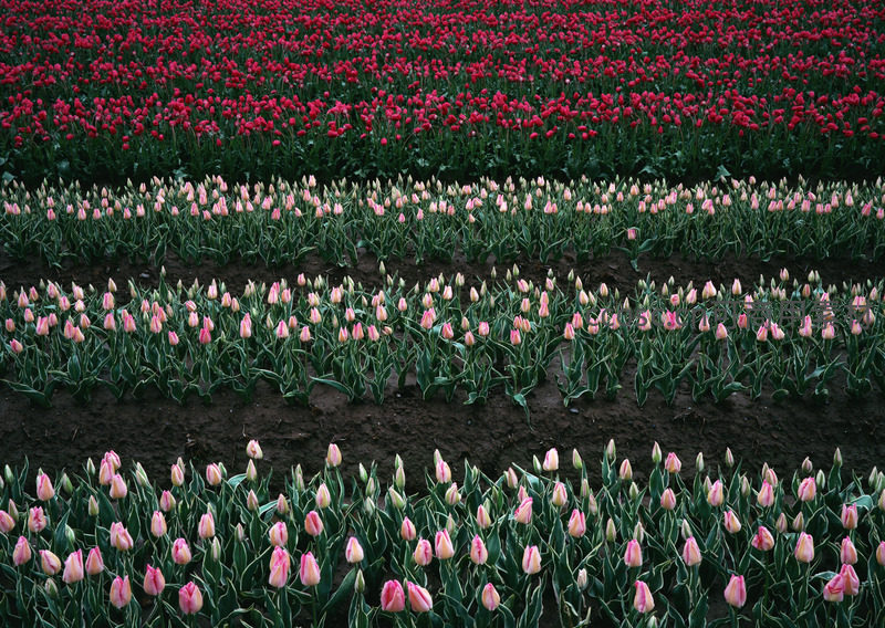 层层叠叠的粉色与白色郁金香在深色土壤上绽放,柔和的色调营造出宁静氛围,仿佛置身于诗意的春日梦境之中。