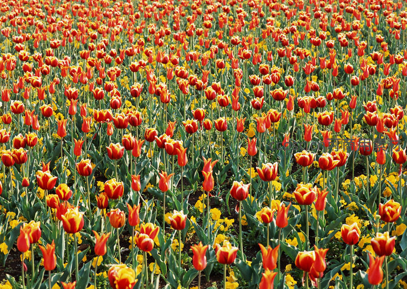 广阔田野中,红黄相间的郁金香竞相开放,绿叶衬托下色彩鲜艳夺目,展现春日盎然生机与自然之美。