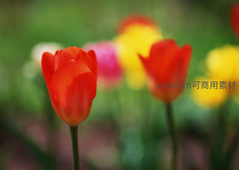 红郁金香特写,背景虚化色彩斑斓