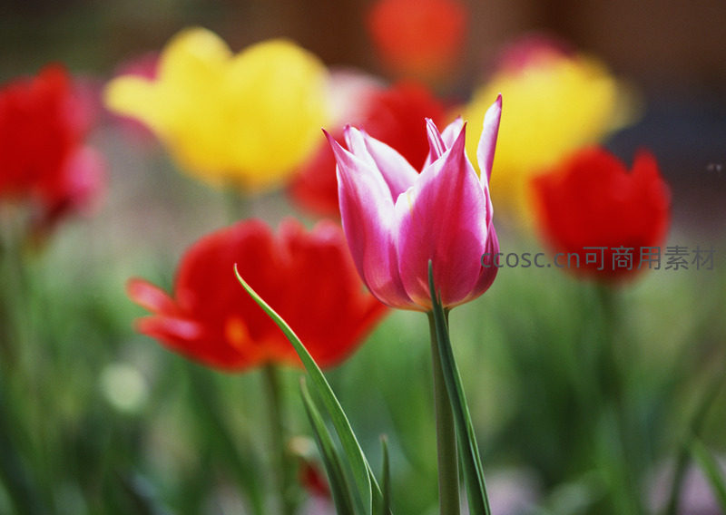 一朵娇嫩的粉红色郁金香挺立于画面中央,周围环绕着模糊的红色与黄色郁金香,绿叶点缀其间,展现出春日花园的生机与活力。