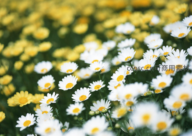 阳光下,洁白的雏菊与明黄的花朵在绿意盎然的田野中竞相绽放,构成一幅清新自然、充满生机的春日画卷。