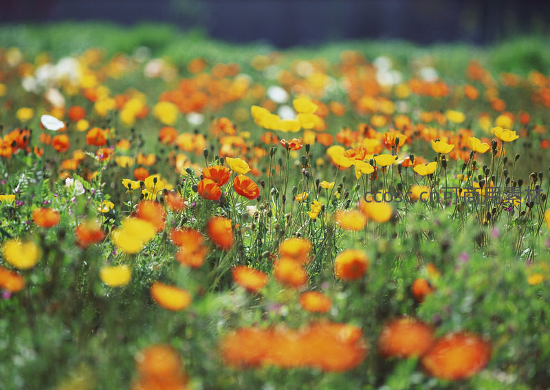 一片生机勃勃的野花田,橙色与黄色的花朵在翠绿草地上绽放,微风轻拂,花瓣摇曳,构成一幅充满活力的自然画卷。