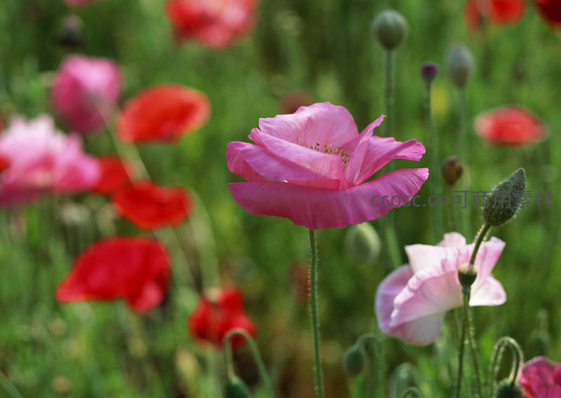 单朵粉罂粟,优雅绽放于花丛