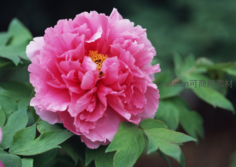 一朵硕大饱满的粉色牡丹盛放,层层叠叠的花瓣如云霞般柔美,金黄色花蕊点缀其间,绿叶衬托,尽显国色天香之姿。