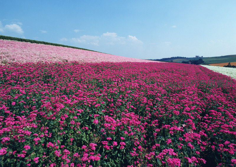 连绵起伏的山坡被粉色花海覆盖,与湛蓝天空和朵朵白云相映成趣,构成宁静而浪漫的画面,是春日踏青赏花的绝佳去处。