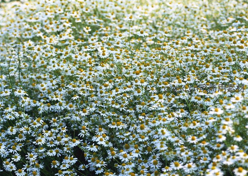大片白色雏菊在阳光下绽放,花瓣洁白,花心金黄,绿叶衬托,充满春天的气息和自然的宁静。