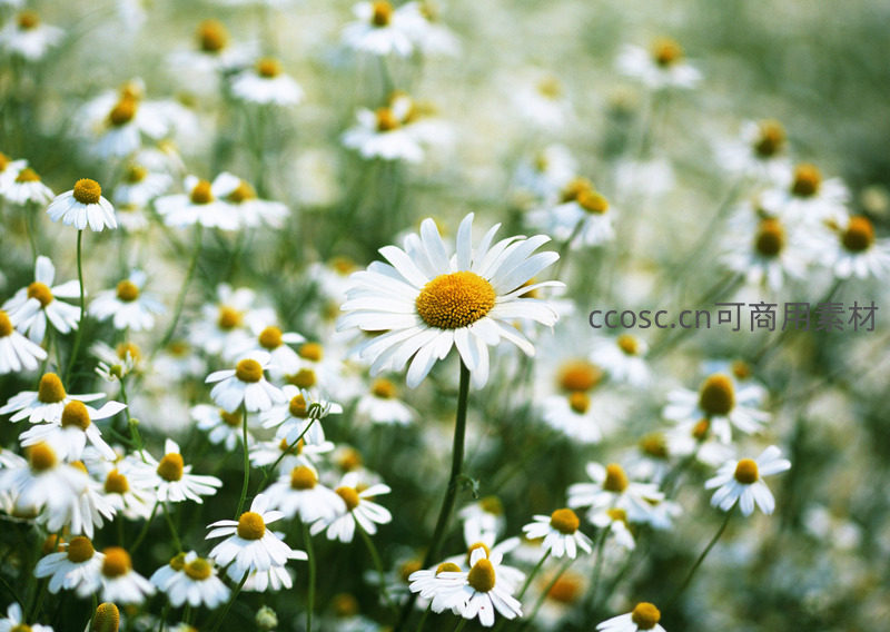 一朵雏菊在众多同伴中脱颖而出,清晰的花瓣和饱满的花蕊在柔和光线下显得格外生动,背景朦胧。