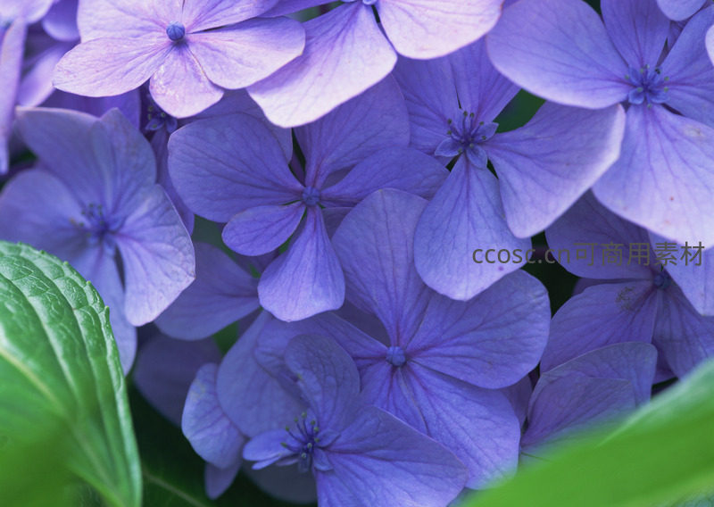 镜头深入紫色绣球花的花瓣内部,细腻的脉络和柔和的色泽一览无余,边缘的绿叶作为点缀,突显了花朵的精致与柔美质感。