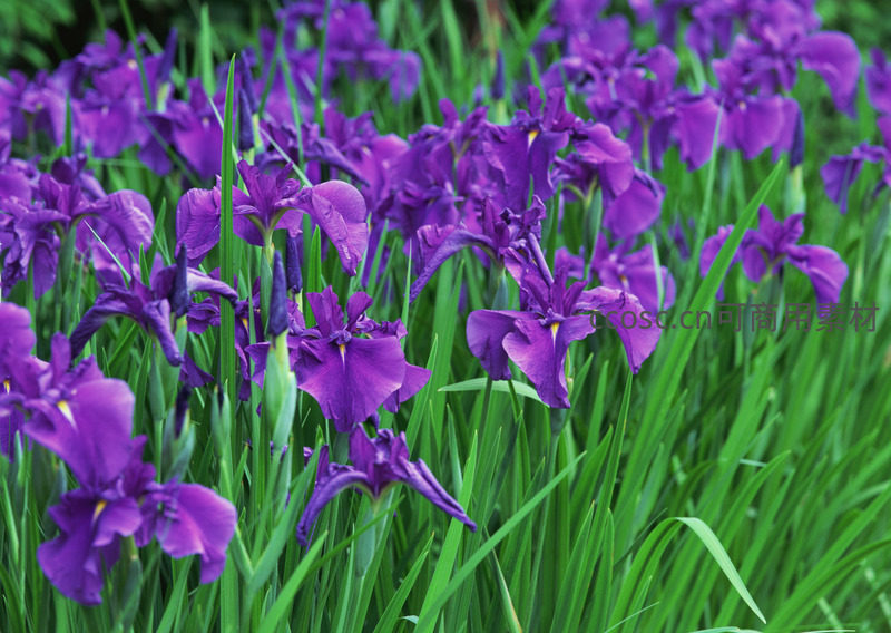大片紫色鸢尾花在翠绿叶片的衬托下竞相绽放,形成一片梦幻般的花海,充满春天的活力与自然之美。
