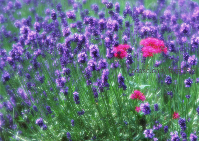 紫色薰衣草花海中突然出现几朵明艳的红色花朵,形成强烈的视觉冲击,展现了大自然色彩搭配的奇妙与和谐。