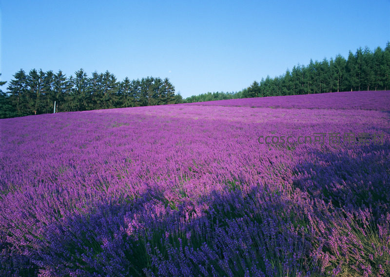 起伏的山坡上紫色薰衣草与翠绿树林、湛蓝天空构成鲜明对比,展现自然风光的层次与色彩搭配的和谐美感。