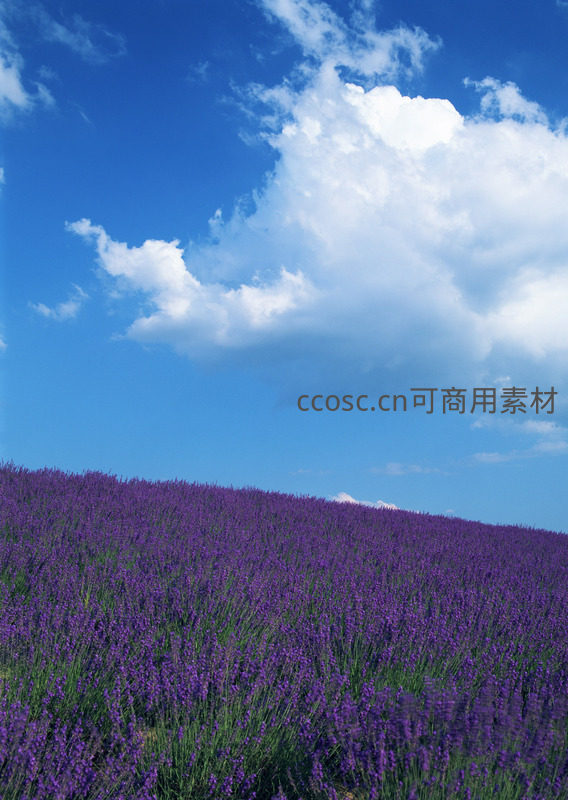 一片无边无际的紫色薰衣草花田铺展在眼前,上方是纯净的蓝色天空和蓬松的白色云朵,营造出梦幻般的自然美景。