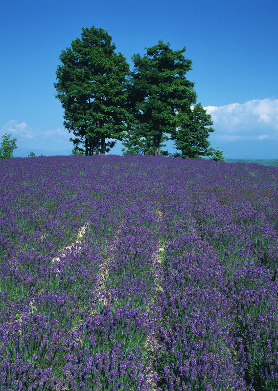 紫色薰衣草花海中央,一条小径蜿蜒通向山顶,两棵苍翠大树静立其上,蓝天白云为背景,景色如画般宁静优美。