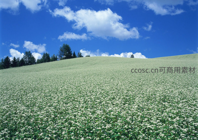 起伏的绿色山坡被密集的白色小花覆盖,在晴朗蓝天和白云的映衬下,呈现出一派生机勃勃、宁静祥和的自然景象。