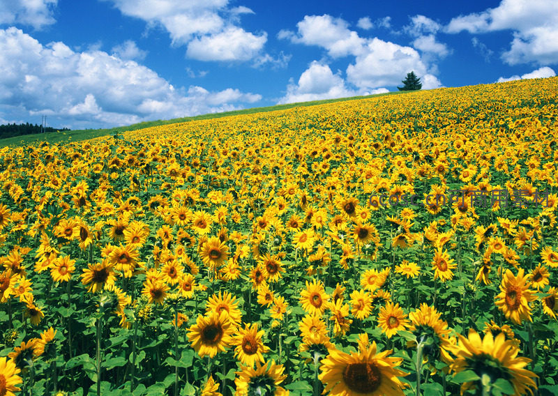 层层叠叠的向日葵沿着缓坡蔓延,与远方地平线相接,头顶蓝天白云,展现出大自然的壮美与丰收的喜悦景象。