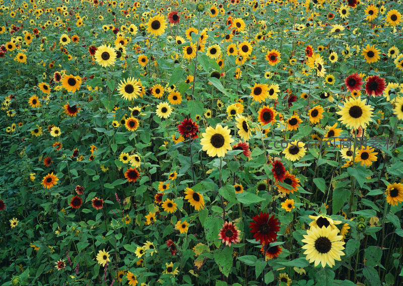 向日葵花田中点缀着红色品种,黄红相映成趣,宛如大自然挥洒的油彩,在绿叶衬托下更显绚丽夺目。