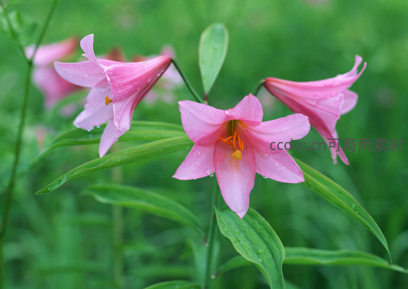 几朵粉嫩的百合花在雨后绽放,花瓣上挂着晶莹剔透的水珠,橙色花蕊在绿叶映衬下更显娇艳欲滴,清新动人。