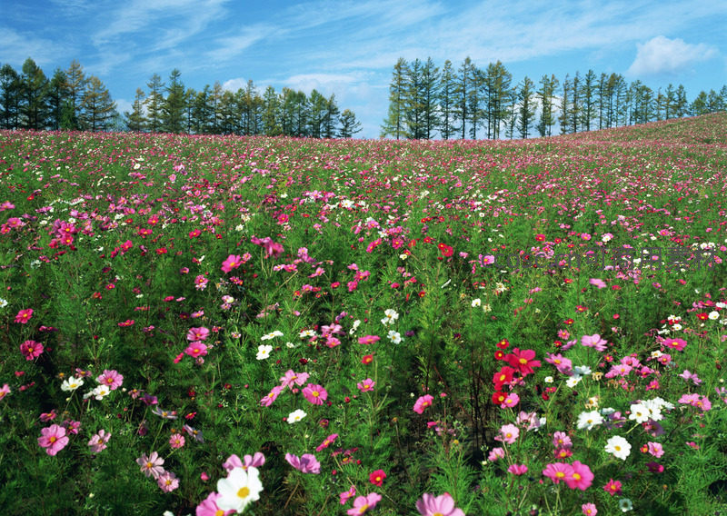 五彩斑斓的波斯菊在翠绿草地上竞相开放,远处整齐的树木勾勒出地平线,宛如童话中的仙境花园。