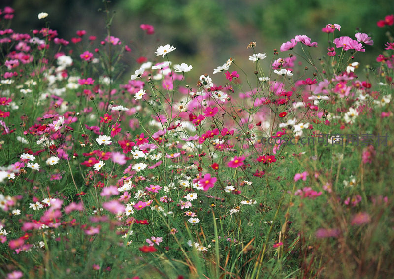 粉、白、红三色波斯菊在绿意盎然的草地上竞相开放,高低错落,层次分明,仿佛置身于一个充满生机与幻想的彩色花园。