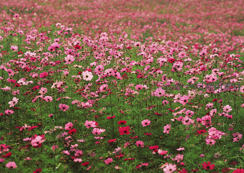 无边无际的粉红色波斯菊花田覆盖大地,如同一张柔软的花毯铺展在山谷之间,微风拂过,花浪翻滚,尽显自然的壮丽与温柔。