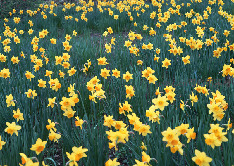 大片金黄色的水仙花在田野里竞相开放,与深绿色的叶片交织成一片灿烂的海洋,展现了春天蓬勃的生命力和壮丽的自然景观。
