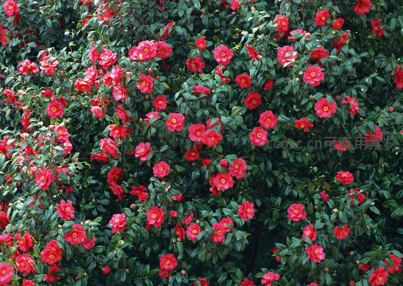 浓密的山茶花树上,无数朵鲜红色的花朵在深绿叶片的映衬下热烈绽放,形成一片如火焰般绚烂的花墙,充满生机与活力。