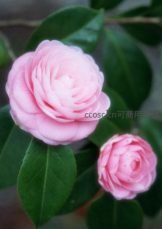 两朵粉嫩的山茶花在绿叶的簇拥下优雅绽放,花瓣层层叠叠如丝绸般柔滑,微距镜头捕捉到其细腻纹理与静谧之美。