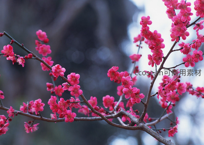 粉红色的梅花在枝头盛开,花瓣娇嫩,背景虚化突出主体,展现早春生机勃勃的自然景象。