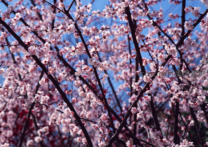 阳光下杏花满枝,洁白中透着淡粉,在湛蓝天空的映衬下如云似雪,营造出春意盎然、生机勃勃的自然景象。