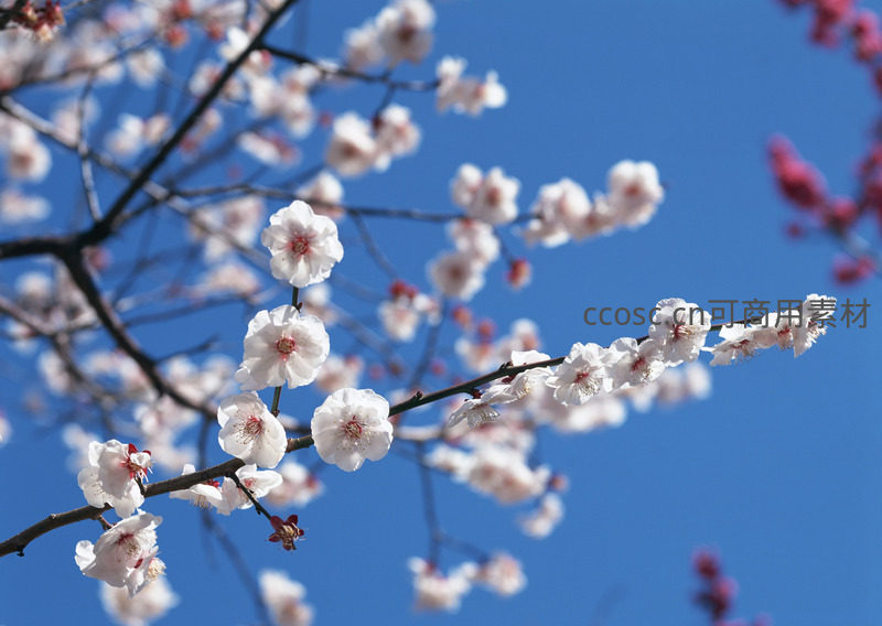 蓝天映衬下绽放的洁白梅花